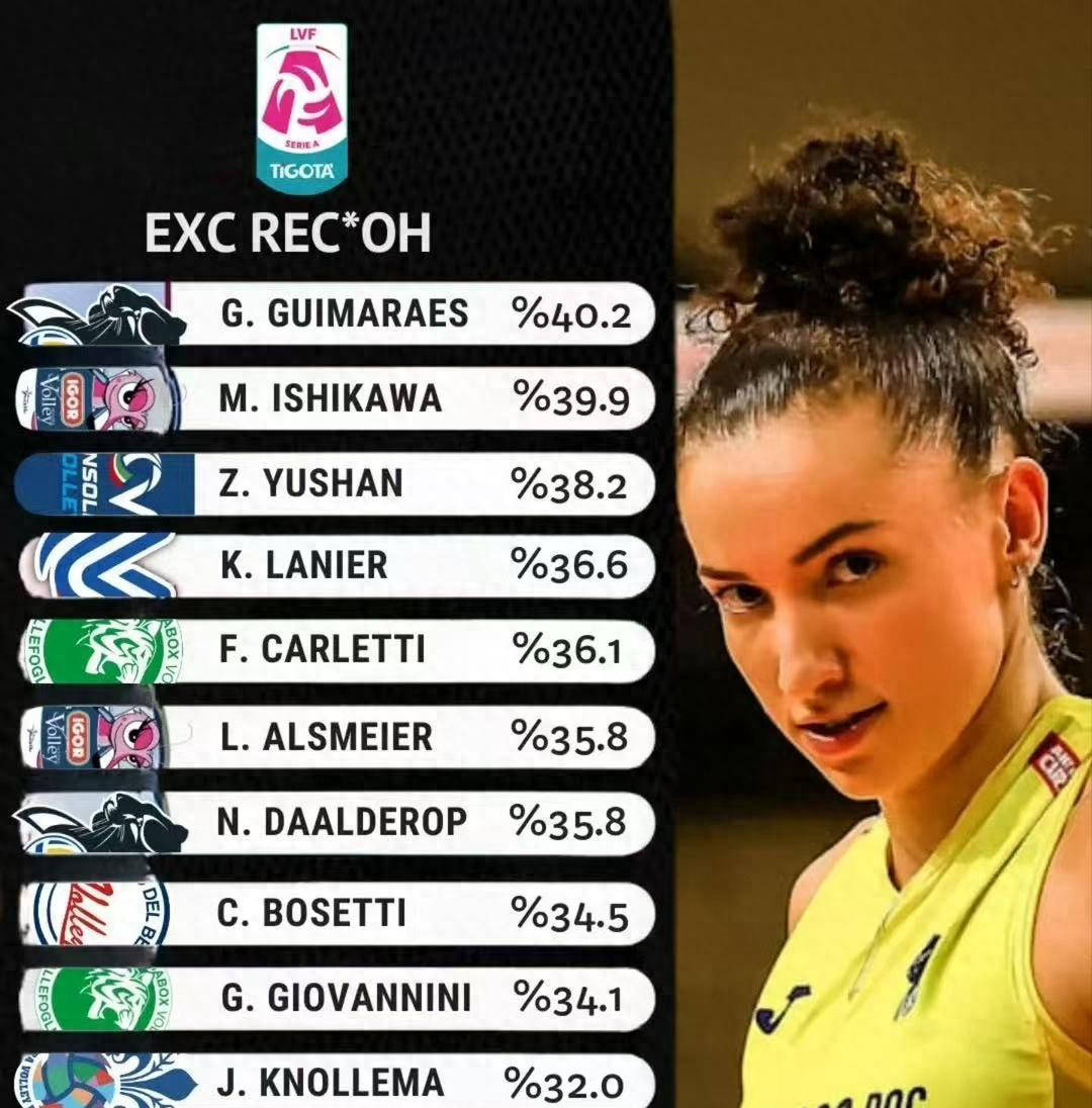 除上述三人外,榜单上还出现了拉尼尔、卡莱迪、阿尔斯迈尔、达尔德罗普、波塞蒂、乔瓦尼尼、克诺莱玛和皮瓦等实力派球员。自庄宇珊加盟圣乔瓦尼以来,她迅速确立了球队主力位置,并成为核心球员之一。由于她承担着大量进攻任务,常遭对手重点盯防。然而,她在面对重压和持续追发的情况下,依然保持着极高的一传到位率,彰显了她卓越的一传能力和心理素质。